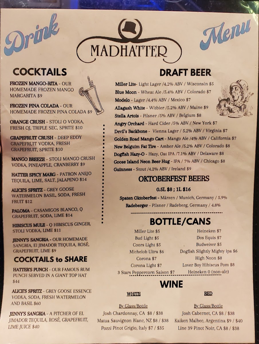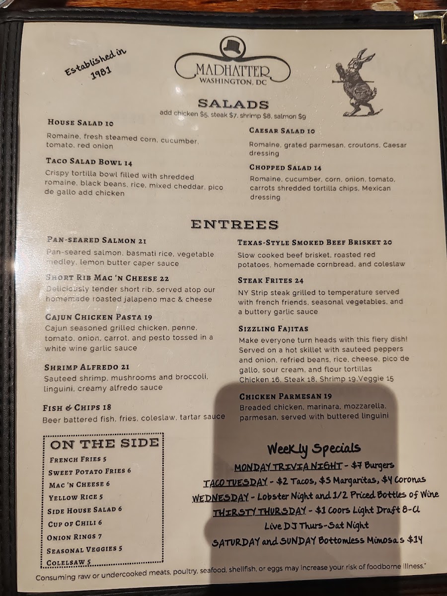 Welcome to Madhatter, a charming eatery nestled at 1319 Connecticut Ave NW, Washington, DC. With a menu that caters to diverse tastes, Madhatter expertly blends creativity with comfort. Start your meal with vibrant salads like the Taco Salad Bowl, a delightful crispy tortilla filled with fresh ingredients, or indulge in the classic Cobb Salad.